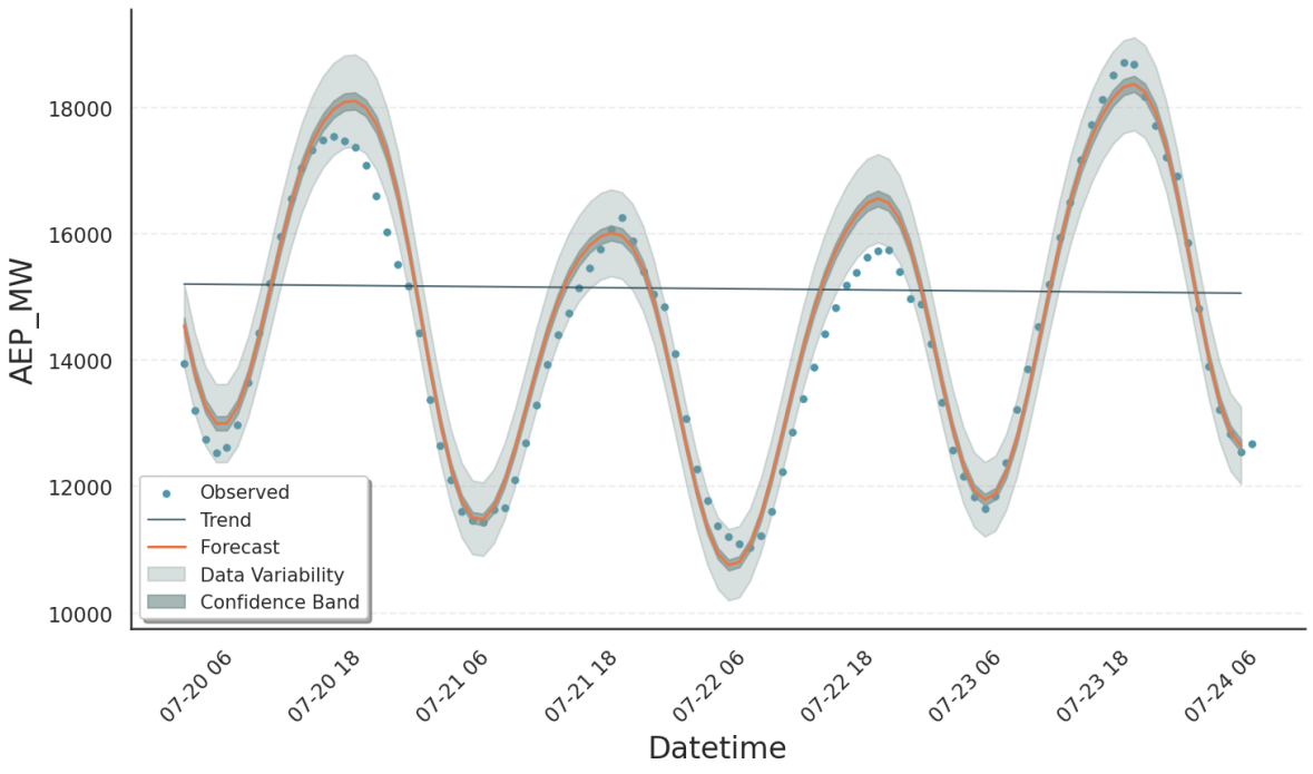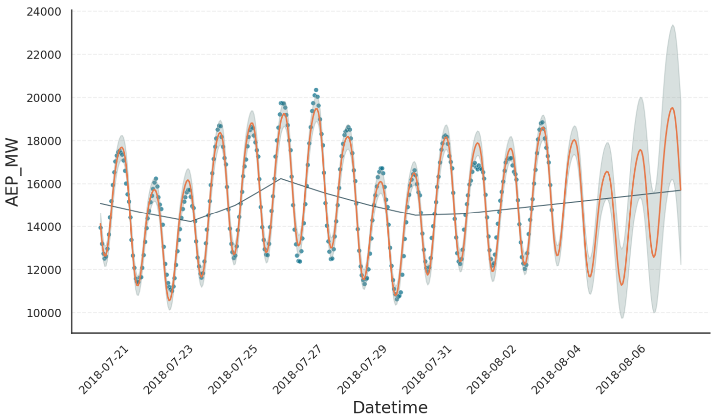 Datetime: Timestamps at which the prediction was evaluated.yhat: The overall prediction, shown as orange solid line.yhat_upper/yhat_lower: Upper and lower bounds on the prediction at a confidence level defined bym.interval_width(default 80%). These bounds are not shown in the plot.observed_lower/observed_upper: Bounds on the variability of the observed data, derived from the underlying distribution model at a quantile level specified bym.interval_width. These bounds are displayed by the grey area.trend: Trend component of the model, shown as black solid line.trend_upper/trend_lower: Bounds corresponding to the trend contribution withinobserved_lower/observed_upper.*_linked_*: The respective quantities on the scale of the underlying generalized linear model, transformed by the link-function. See Decomposition Types tutorial for details.