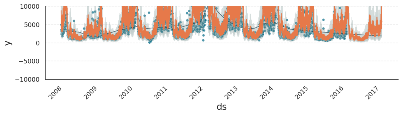 As a side effect of the Poisson model, the trend exhibits exponential growth even though changepoints were completely disabled. We will explore this phenomenon in the next section.