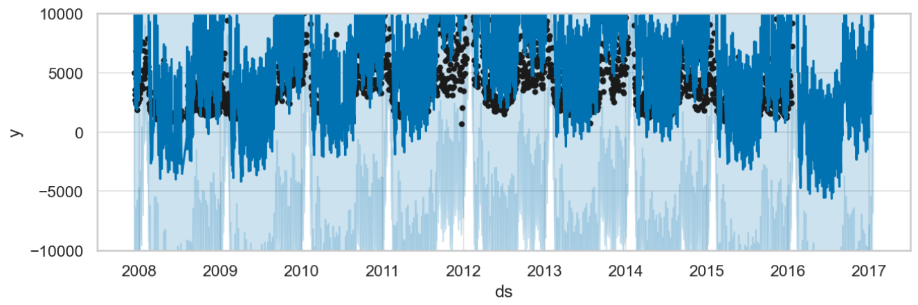 Prophet’s predict method produces a data frame including yhat_upper and yhat_lower columns besides yhat. These upper and lower bounds add an interval of observed noise on top of yhat, corresponding to the variance learned from the data during the fit.