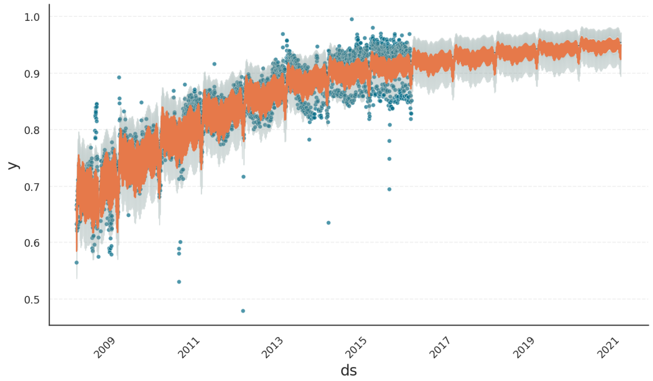 As shown above, Gloria produces the same kind of nonlinear saturating trend. In addition, both seasonal amplitudes and confidence intervals shrink as the forecast approaches the upper bound, ensuring that predictions remain within the valid range at all times.