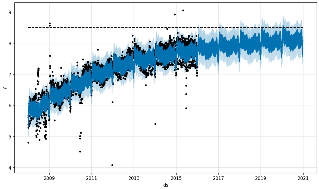 In the resulting forecast, the trend smoothly approaches the specified capacity of 8.5. Note, however, that the capacity applies only to the trend component: seasonal effects are still allowed to exceed the upper limit.